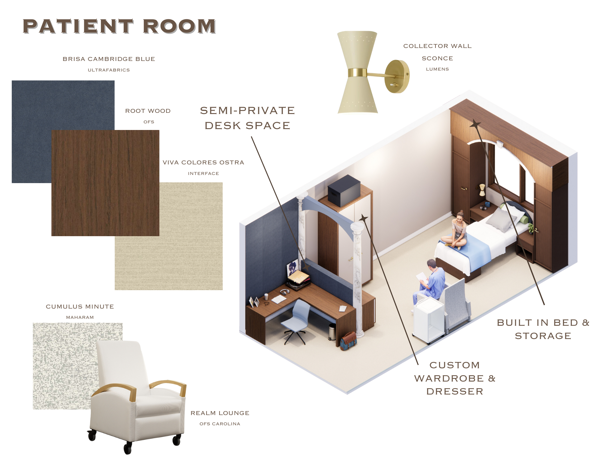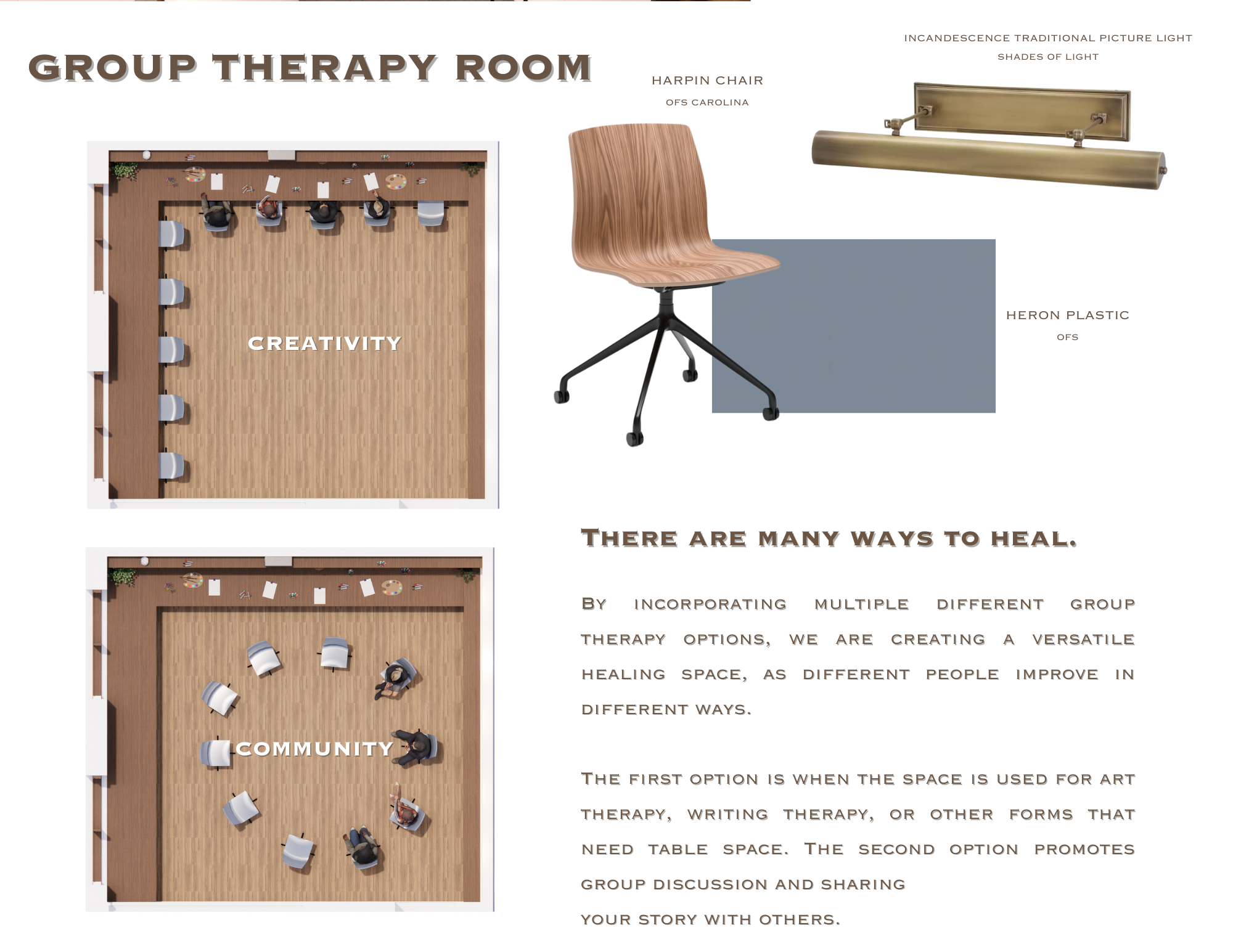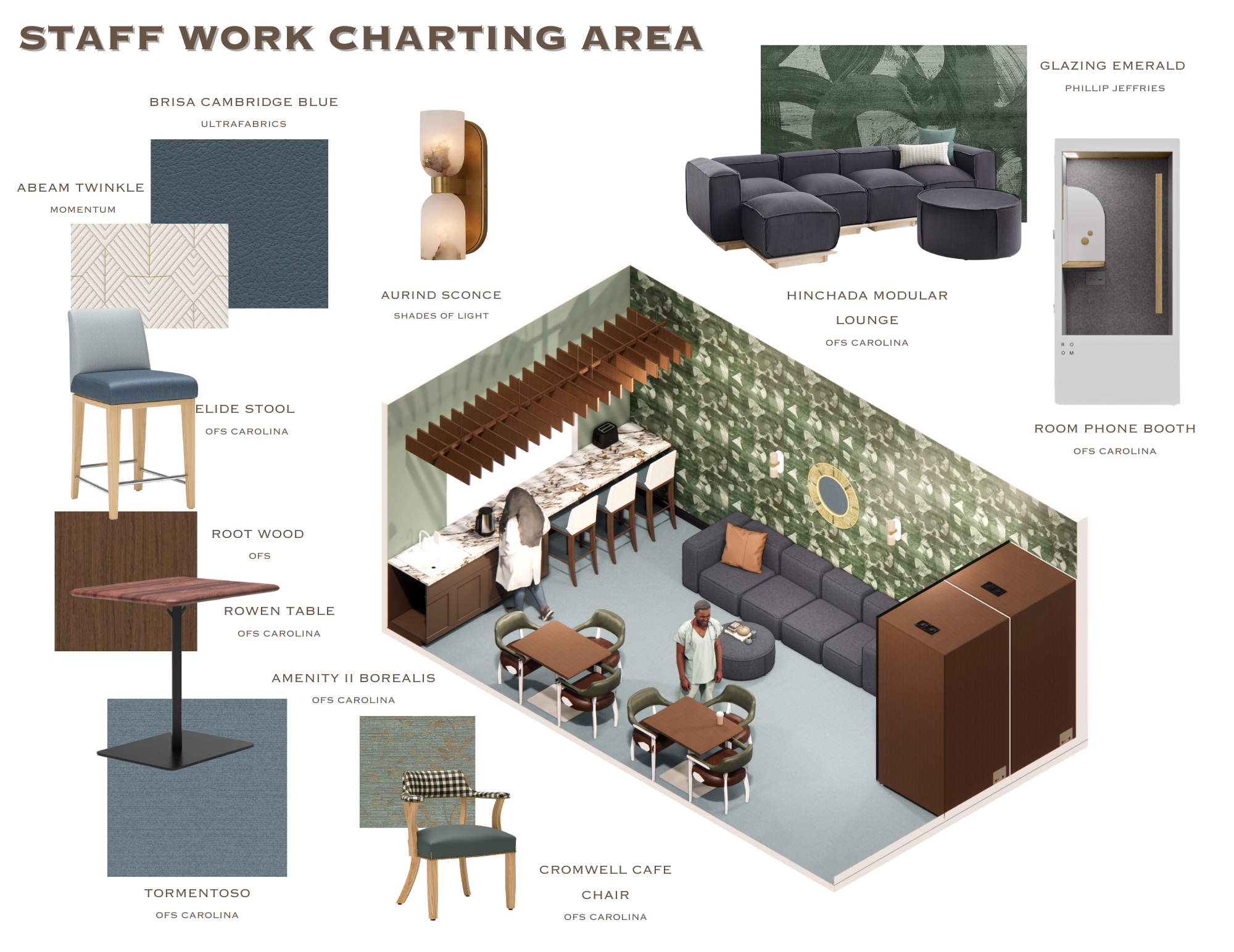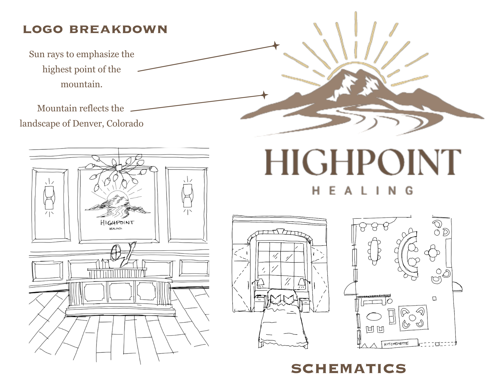 For this project, me and my group were asked to create a brand and design for an adult inpatient healthcare facility located in Denver Colorado. The design scope, customized through research & an understanding of user needs, includes the lobby & reception area, milieu space, courtyard, group/art therapy room, patient rooms & toilet rooms, staff work charting area/lounge, exam room, consult rooms, quiet room, and various storage spaces. Our main priority in this design was to create a facility that feels comfortable, safe, and relaxing for the patients by incorporating warm colors, residential elements, and simple patterns and shapes.