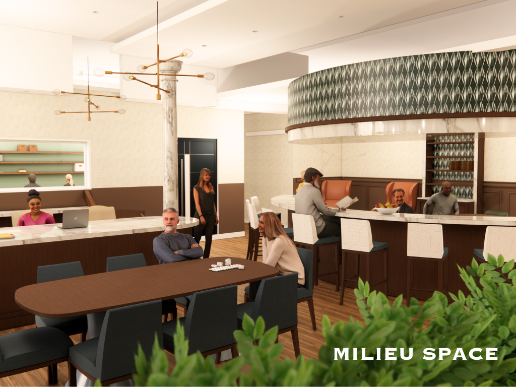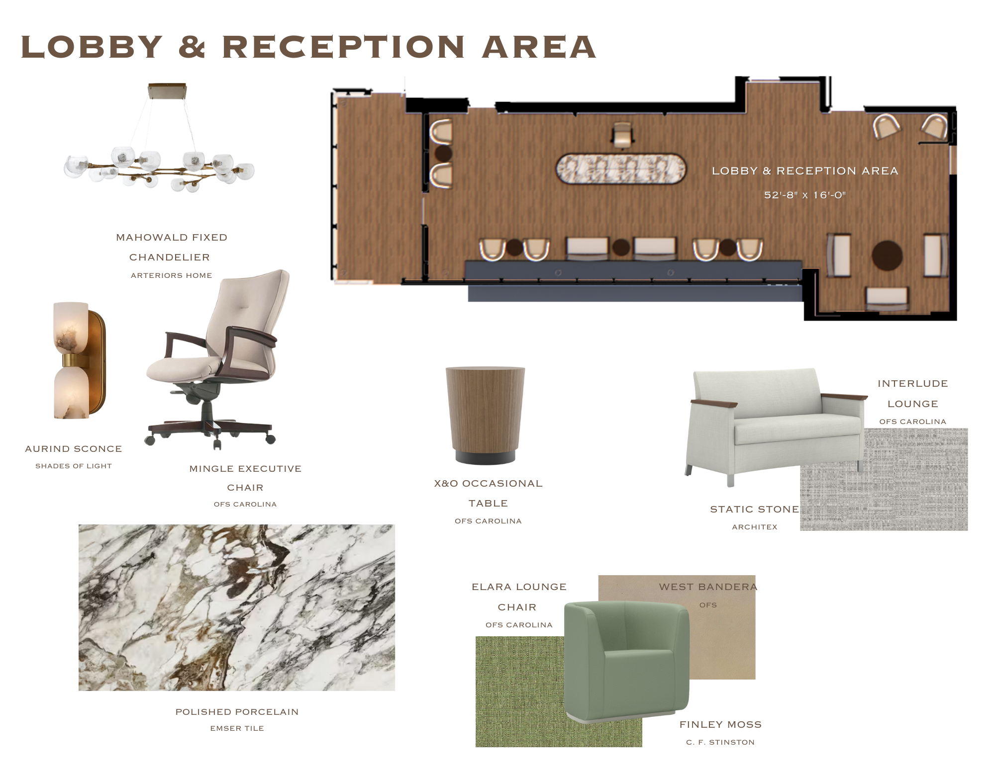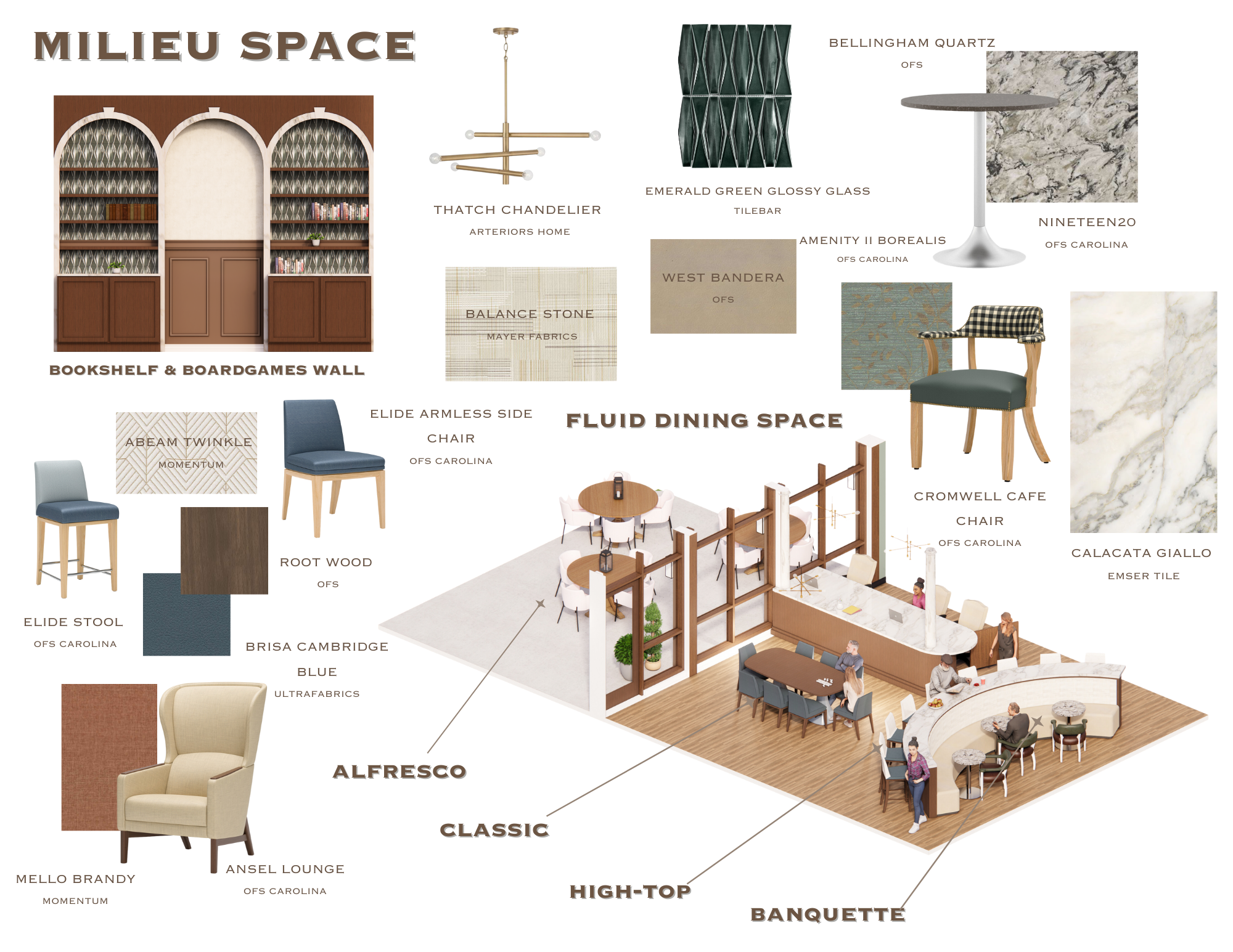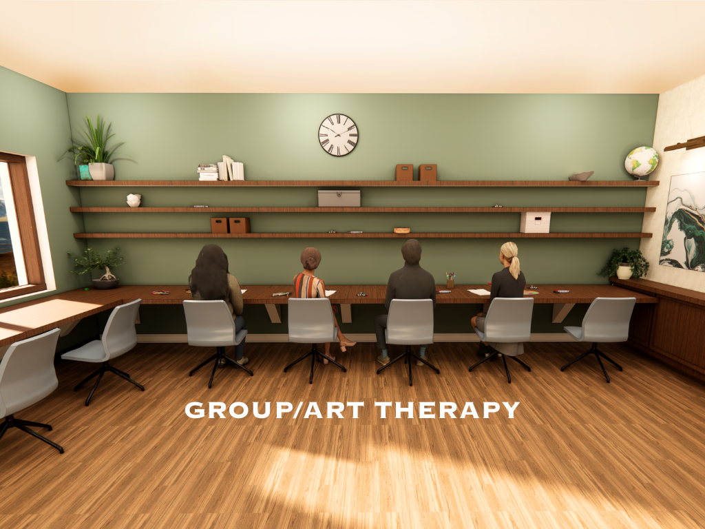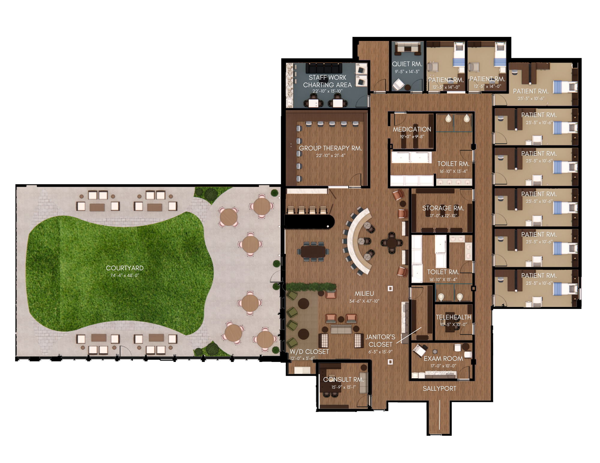 For this project, me and my group were asked to create a brand and design for an adult inpatient healthcare facility located in Denver Colorado. The design scope, customized through research & an understanding of user needs, includes the lobby & reception area, milieu space, courtyard, group/art therapy room, patient rooms & toilet rooms, staff work charting area/lounge, exam room, consult rooms, quiet room, and various storage spaces. Our main priority in this design was to create a facility that feels comfortable, safe, and relaxing for the patients by incorporating warm colors, residential elements, and simple patterns and shapes.