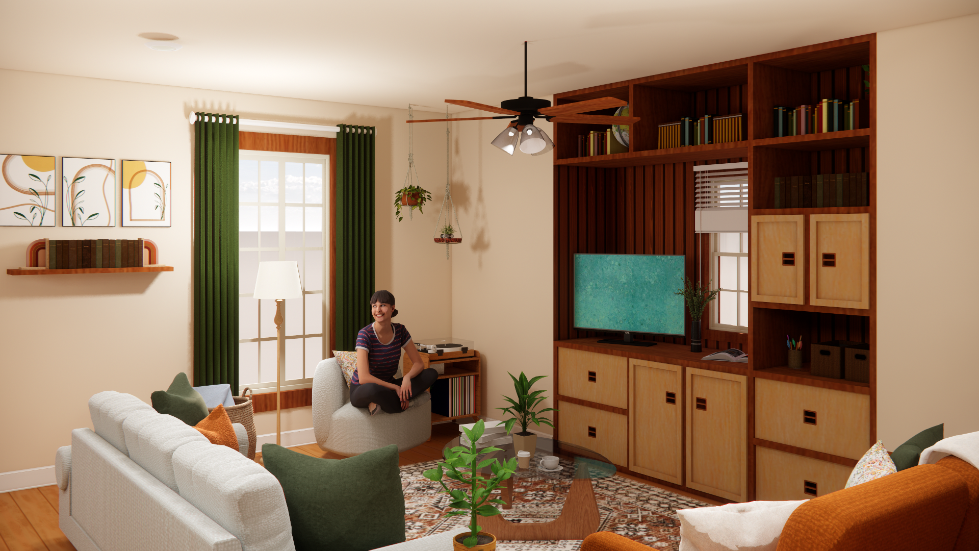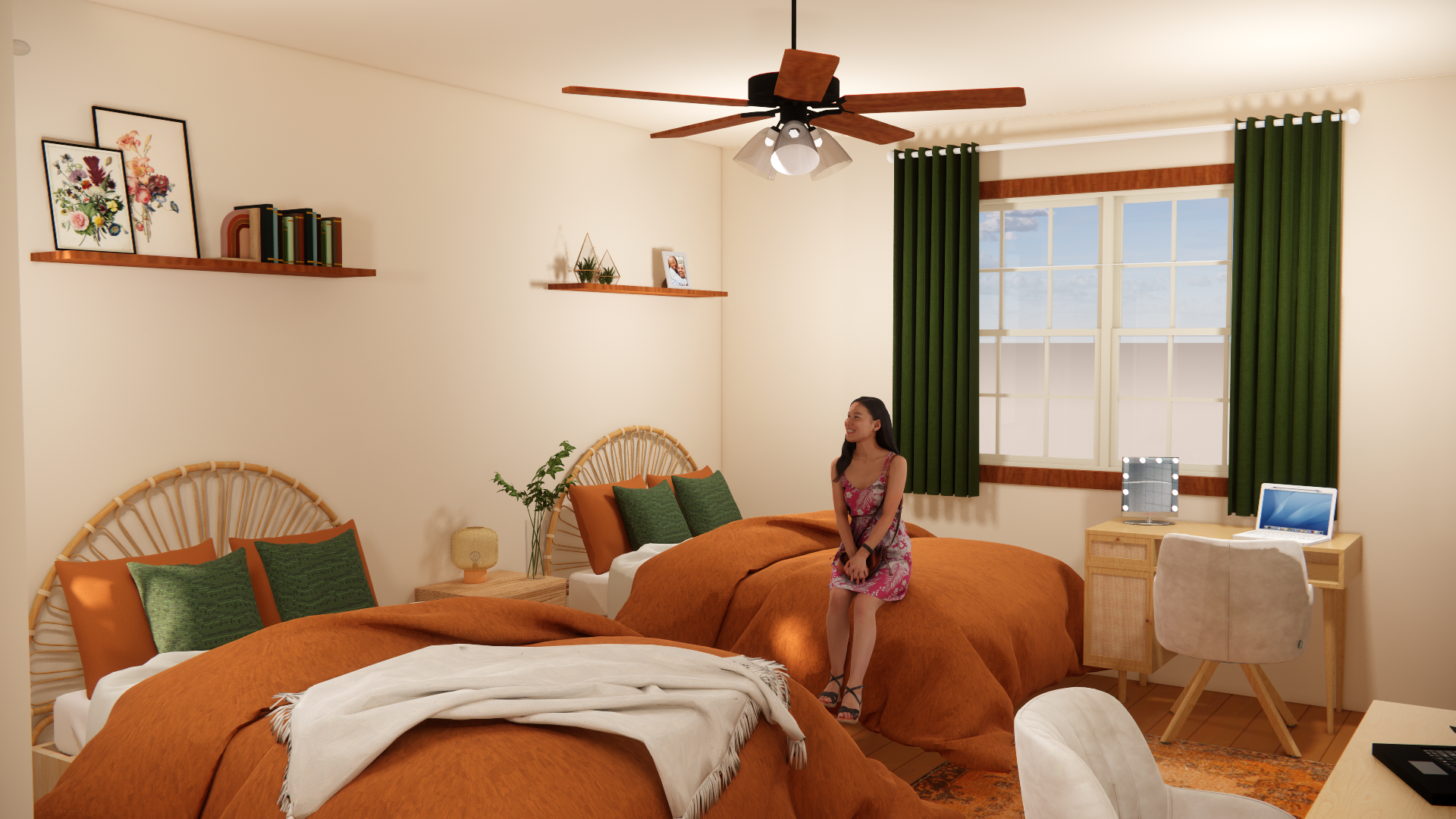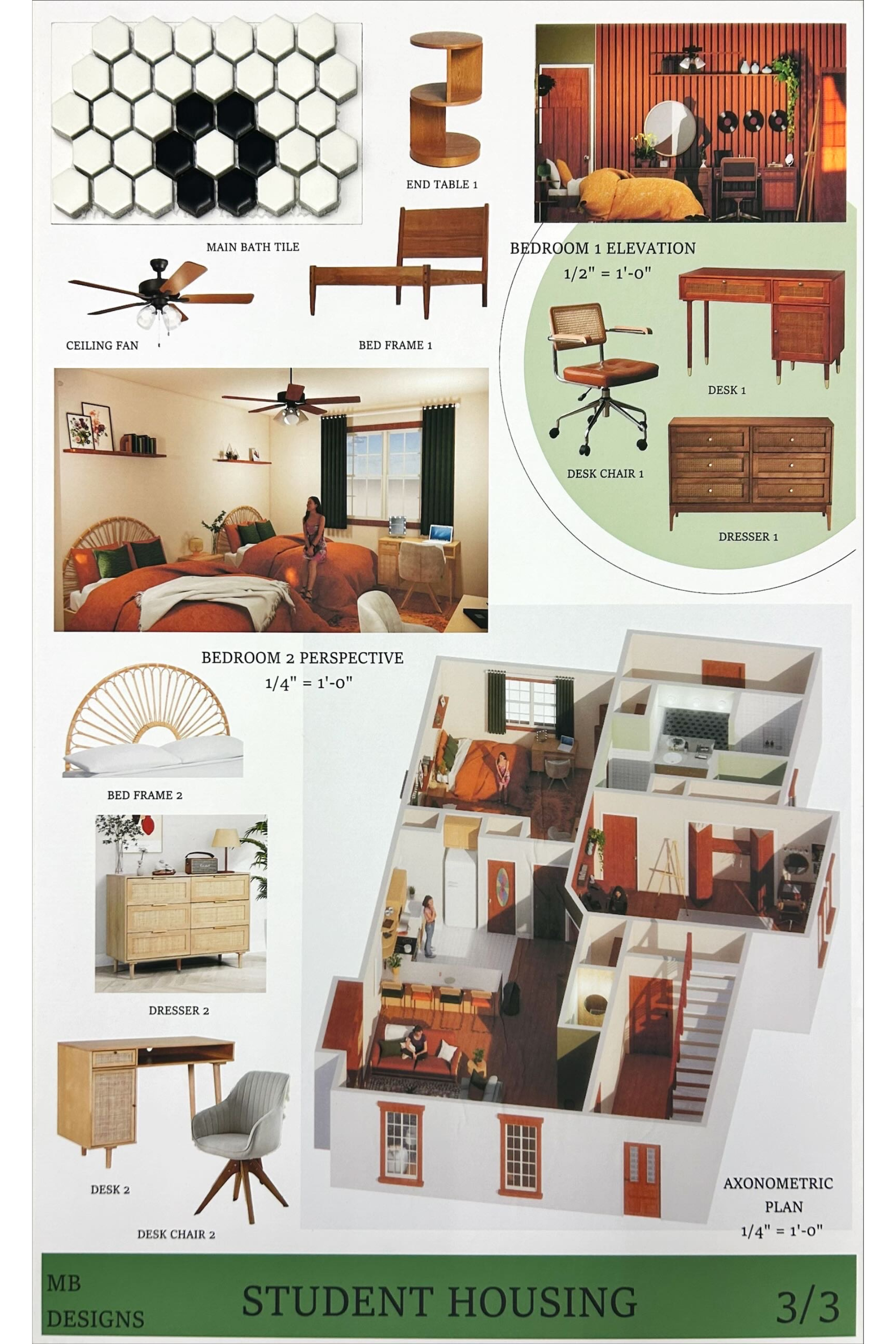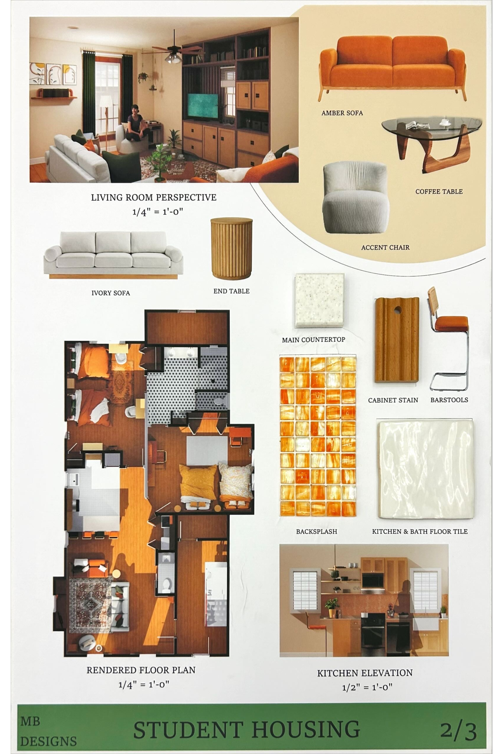 After interviewing four students, for this project, I designed a small apartment in a contemporary bohemian style as my clients requested. This project included space planning, 3D renderings, FF&E selections, and spec sheets, and was required to be designed within a certain shell, with specific dimension requirements. To implement the style requested, I incorporated colors of orange and green, warm wood tones, unique tile selections, and sleek furniture.