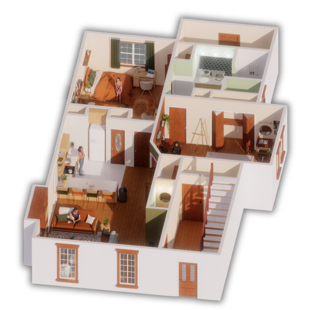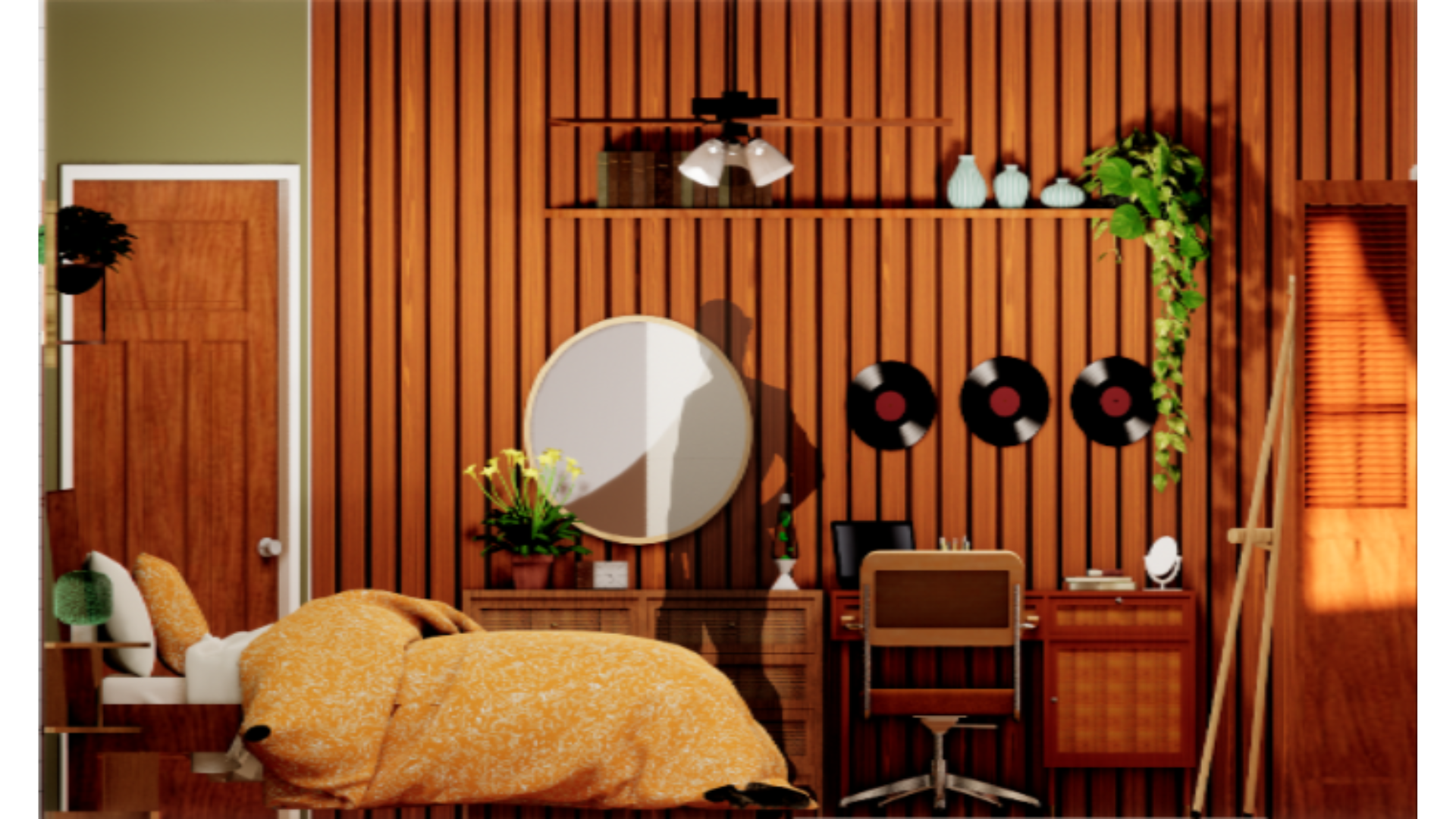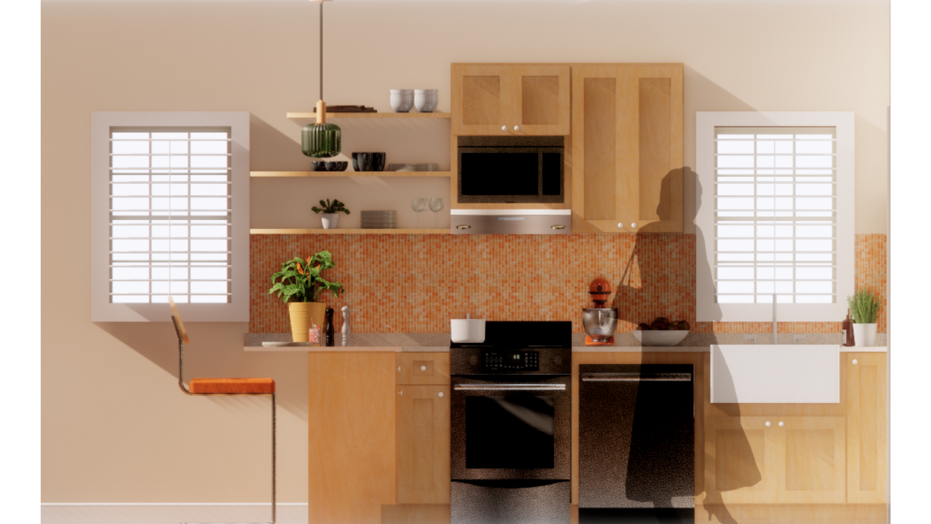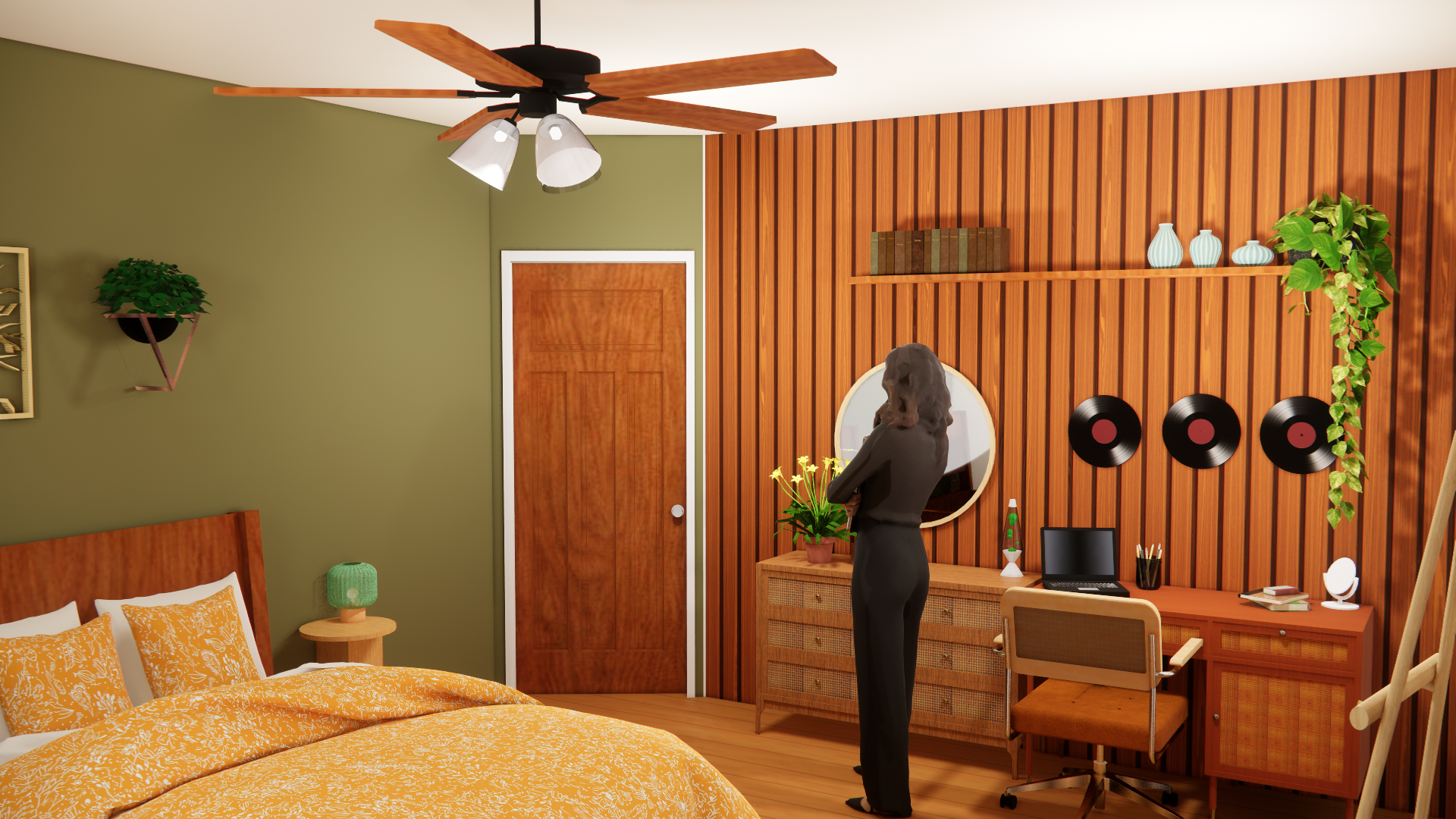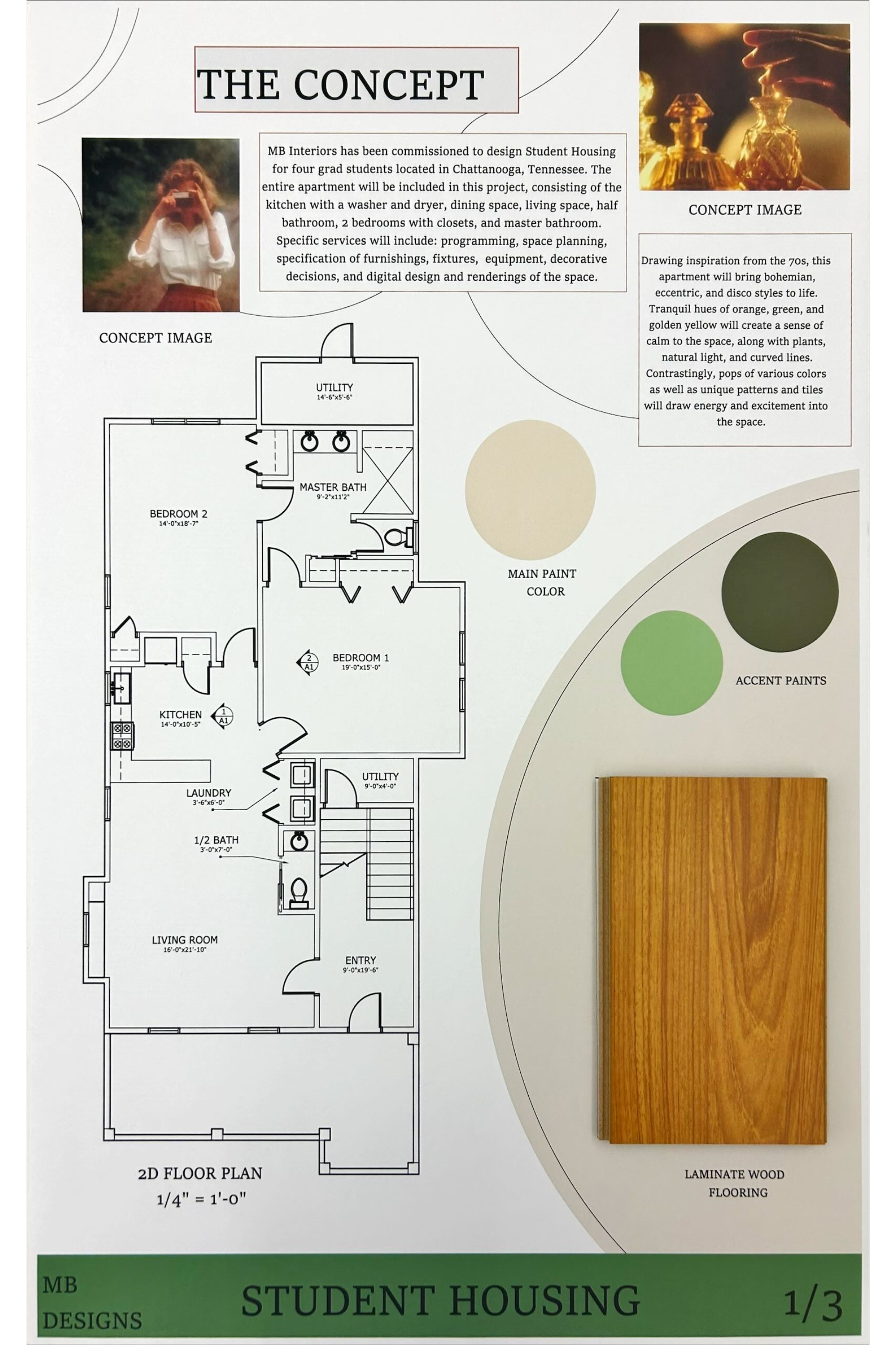 After interviewing four students, for this project, I designed a small apartment in a contemporary bohemian style as my clients requested. This project included space planning, 3D renderings, FF&E selections, and spec sheets, and was required to be designed within a certain shell, with specific dimension requirements. To implement the style requested, I incorporated colors of orange and green, warm wood tones, unique tile selections, and sleek furniture.
